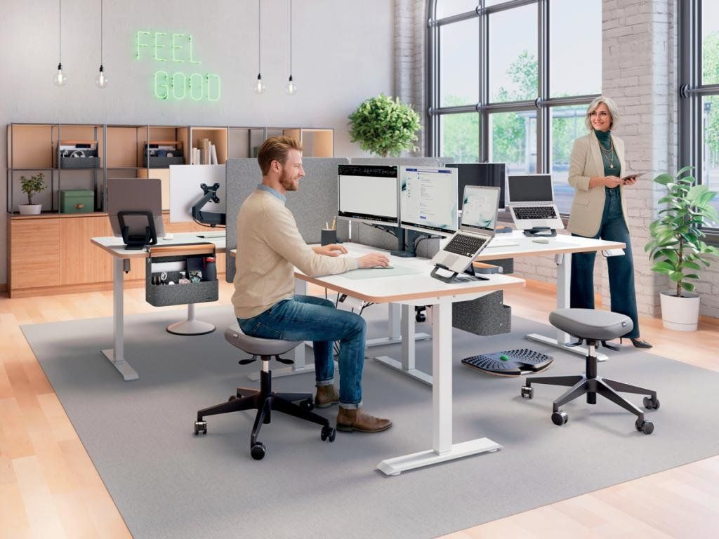 • Jednoduché prepínanie medzi sedením a státím pomáha zmierniť bolesti chrbta a krku a zvyšuje produktivitu a hladinu energie
