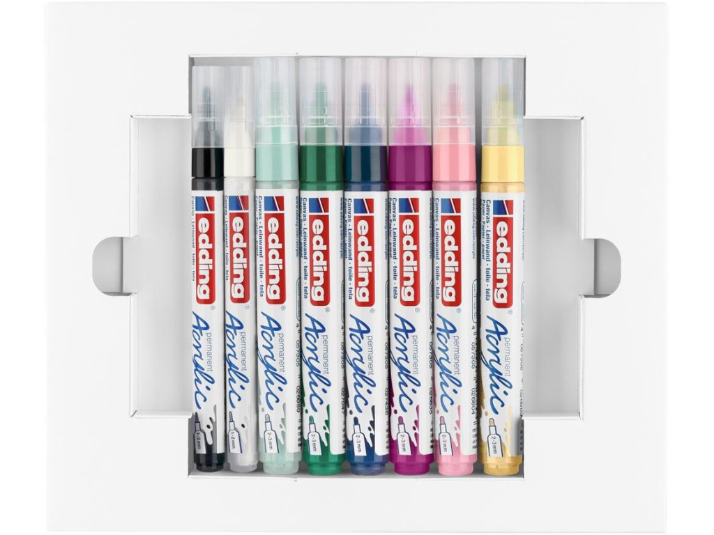 Akrylový popisovač na maľovanie na svetlé alebo tmavé povrchy, ideálny na materiály ako plátno alebo maliarsky papier. Súprava obsahuje 2 akrylové popisovače s tenkým hrotom edding 5300 a 6 akrylových popisovačov so stredne širokým hrotom edding 5100. edding 5300 akrylový popisovač s tenkým hrotom: 1x čierna, dopravná biela. edding 5100 akrylový popisovač so stredne širokým hrotom: 1x sýta mätová, elegantná nočná modrá, klasická slezová, pastelovožltá, purpurová a machovozelená. Vysoko kvalitná pigmentovaná akrylová farba na báze vody je po zaschnutí permanentná, nepriehľadná, svetlostála a bez zápachu. Farby čierna, elegantná nočná modrá, purpurová a machovo zelená sú vysoko krycie. Ostatné odtiene sú polopriehľadné.. Vhodné náhradné hroty (edding 5100 a 5300 náhradné hroty) sú dostupné.