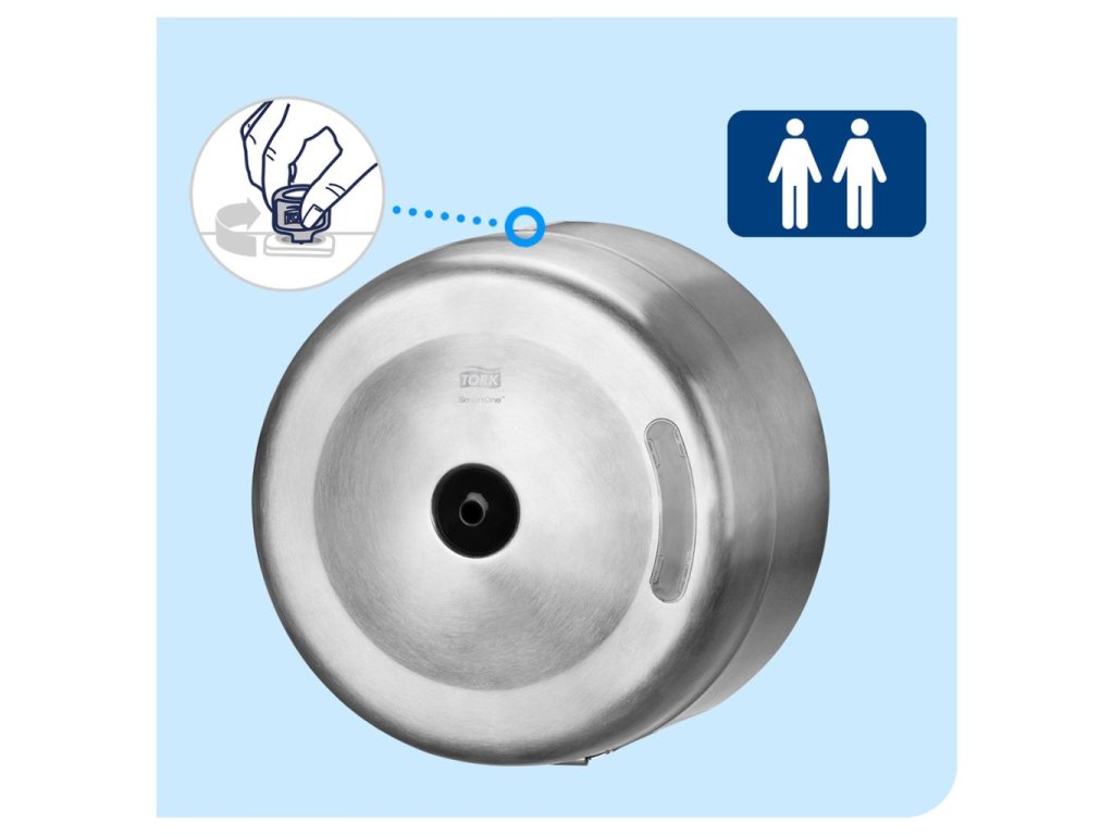 Tork SmartOne zásobník na toaletný papier v kotúčoch je účinný a veľmi robustný dávkovací systém vhodný pre náročné toalety a umyvárne s vysokou návštevnosťou. Dávkovanie po útržkoch pomáha znižovať spotrebu až o 40 % v porovnaní s tradičnými jumbo kotúčovými zásobníkmi, čo znamená viac návštev na jeden kotúč.Materiál: kov