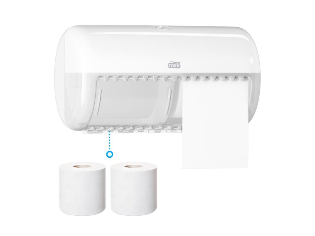 Tork zásobník na toaletný papier v konvenčnom kotúči v dizajne Elevation je vhodný do menej navštevovaných toaliet a umyvární a znižuje údržbu tým, že pojme až dva konvenčné kotúče. Zásobníky Elevation majú praktický a moderný dizajn, ktorý zanecháva v hosťoch dlhodobý dojem.Materiál: plast