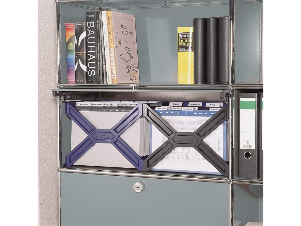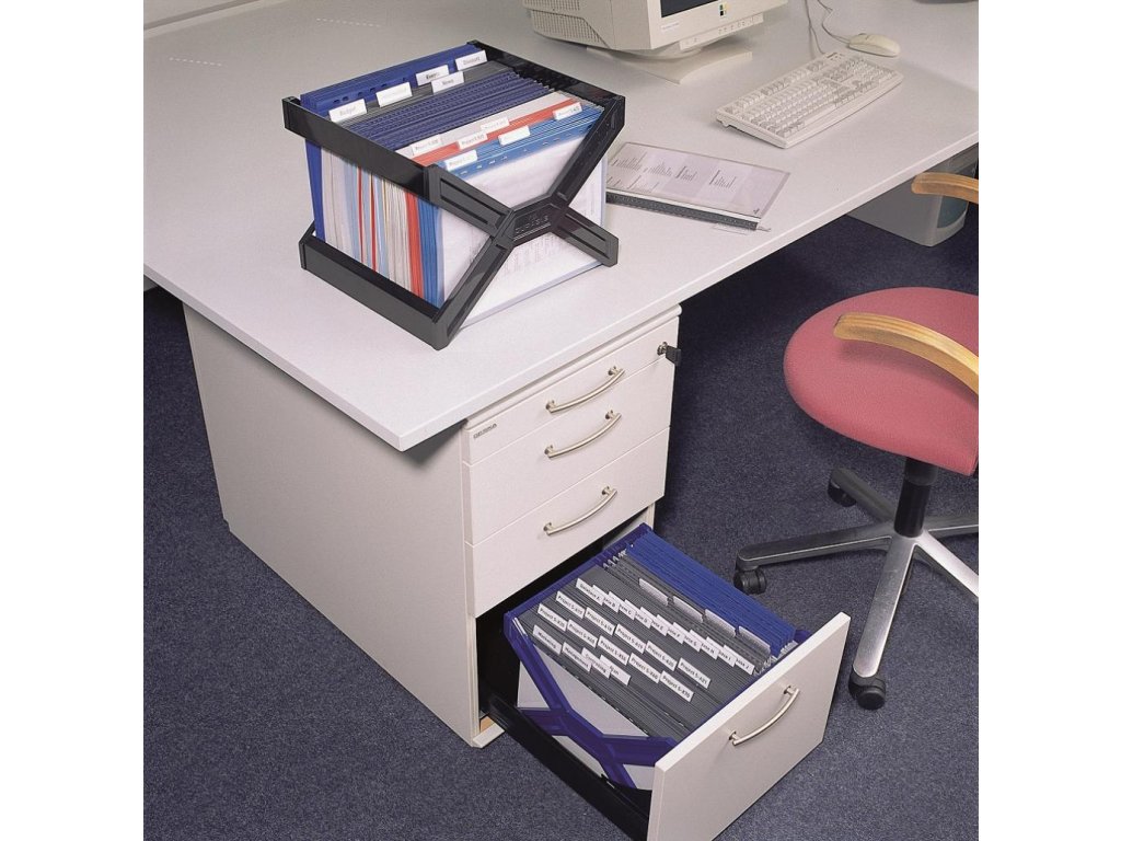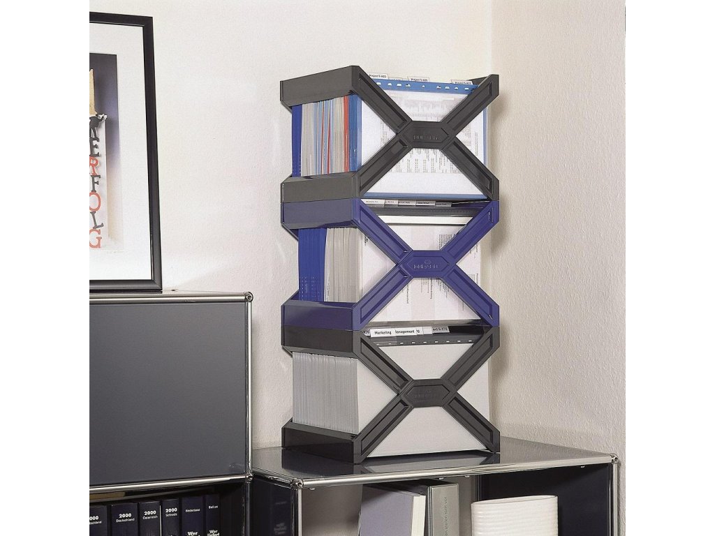 Zásobník na závesné obaly s kapacitou 30 závesných obalov formátu A4. Vhodný na stôl alebo do police. Rám vyrobený z tvrdeného plastu s možnosťou stohovania niekoľkých zásobníkov nad sebou. Rozmery 360 × 270 × 320 mm.Farba: čierna