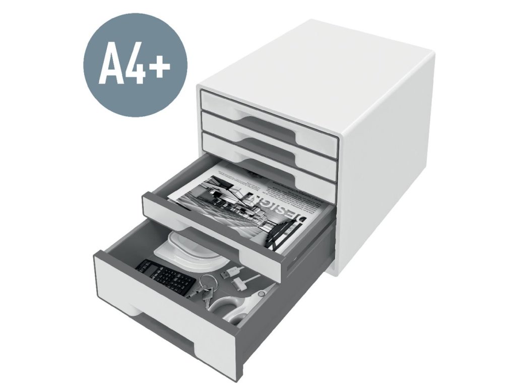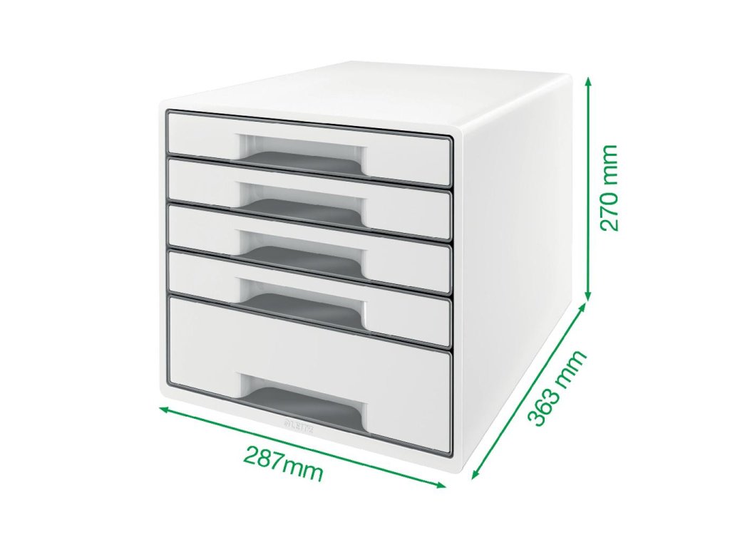 Box, dopĺňajúci produktovú radu Leitz WOW. Ľahko vysúvateľné 4 malé a 1 veľká zásuvka so zarážkou proti úplnému vysunutiu, jednoduché otváranie a zatváranie. Gumové nožičky pre lepšiu stabilitu, rozlišovač na popis zásuvky. Rozmery 287 × 270 × 363 mm. Farba červená.Dodatočné parametre