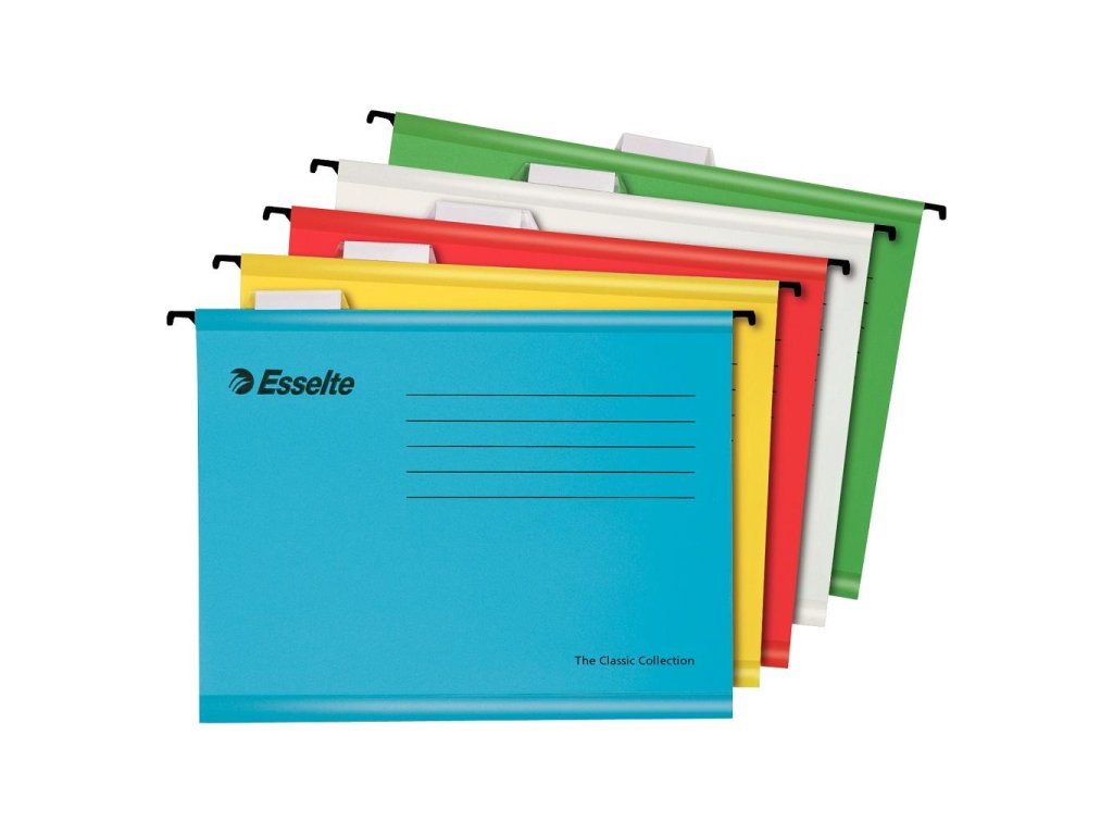 Závesné obaly Esselte kolekcie Classic vyrobené z pevného kartónu. Lisované dno obalu dovoľuje zvýšiť kapacitu na 30 mm. Súčasťou obalu je násuvný index z priehľadného plastu s výmenným papierovým štítkom. Formát A4, rozpätie vodiacich líšt 330 mm. Dodávané spolu s 5 kartónovými prúžkami na spevnenie dna. Balenie 10 ks v mixe farieb.Farba: mix jasných farieb