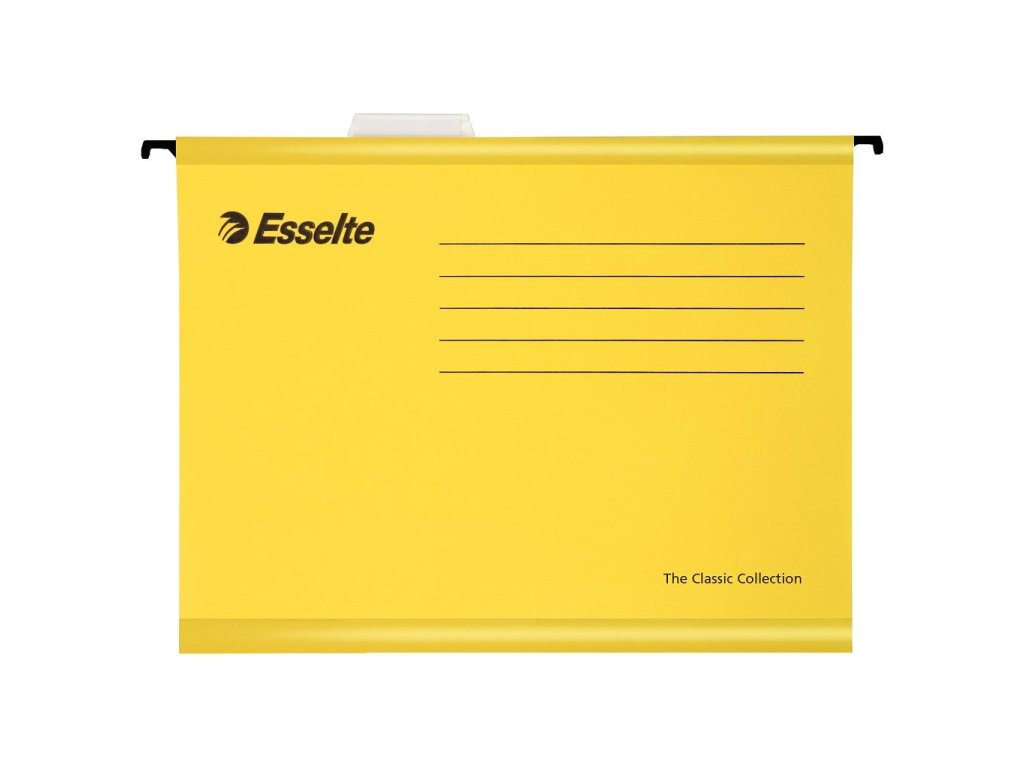 Závesné obaly Esselte kolekcie Classic vyrobené z pevného kartónu. Lisované dno obalu dovoľuje zvýšiť kapacitu na 30 mm. Súčasťou obalu je násuvný index z priehľadného plastu s výmenným papierovým štítkom. Formát A4, rozpätie vodiacich líšt 330 mm.Farba: jasná žltá