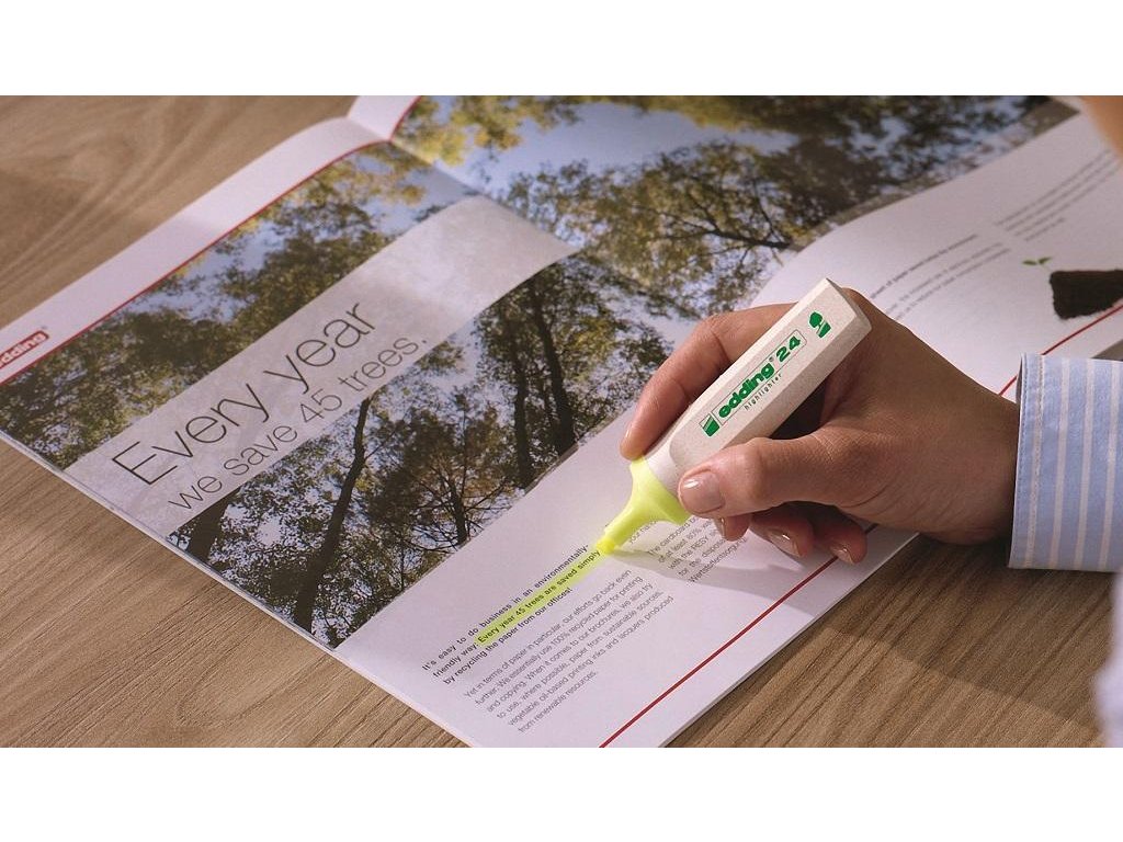 Minimálne 90% tela a uzáveru zvýrazňovača vyrobené z obnoviteľných zdrojov. Zvýrazňovač so zrezaným hrotom so šírkou stopy 2 - 5 mm. Pre zvýraznenie textových pasáží, poznámok a pod. Atrament na vodnej báze s intenzívnymi farbami. Dopĺňateľný atramentom HTK 25. Balenie 10 ks.Farba: žltá