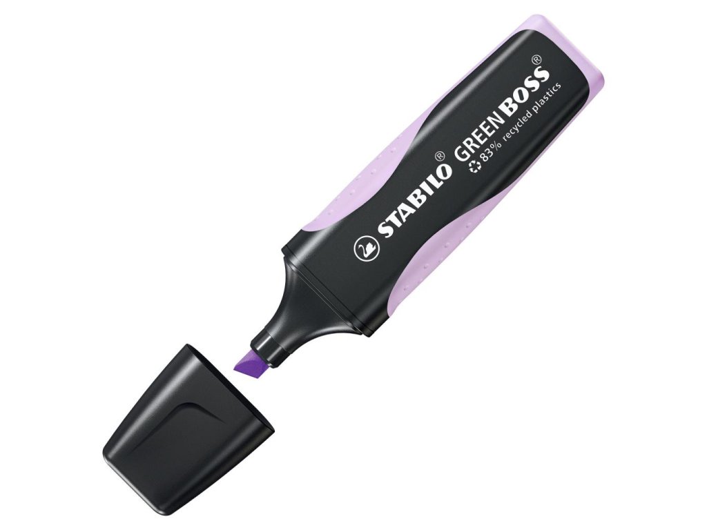 STABILO GREEN BOSS je zvýrazňovač vyrobený z 83% recyklovaného plastu pre školákov, študentov, učiteľov a kancelárskych pracovníkov, ktorí sú ohľaduplní k životnému prostrediu. Ekologický zvýrazňovač je k dispozícii v trendových pastelových a svetlých farbách! Technológia STABILO Anti-Dry-Out chráni pred vysychaním po dobu 4 hodín a zaisťuje koncentrovanú prácu. Značkuje a podčiarkuje v dvoch šírkach stopy 2 a 5 mm. Vďaka protišmykovej zóne úchopu leží bezpečne v ruke. Farba pastelová fialová. Väčšie balenie 10 kusov.- Zvýrazňovač vyrobený z 83 percent recyklovaného plastu