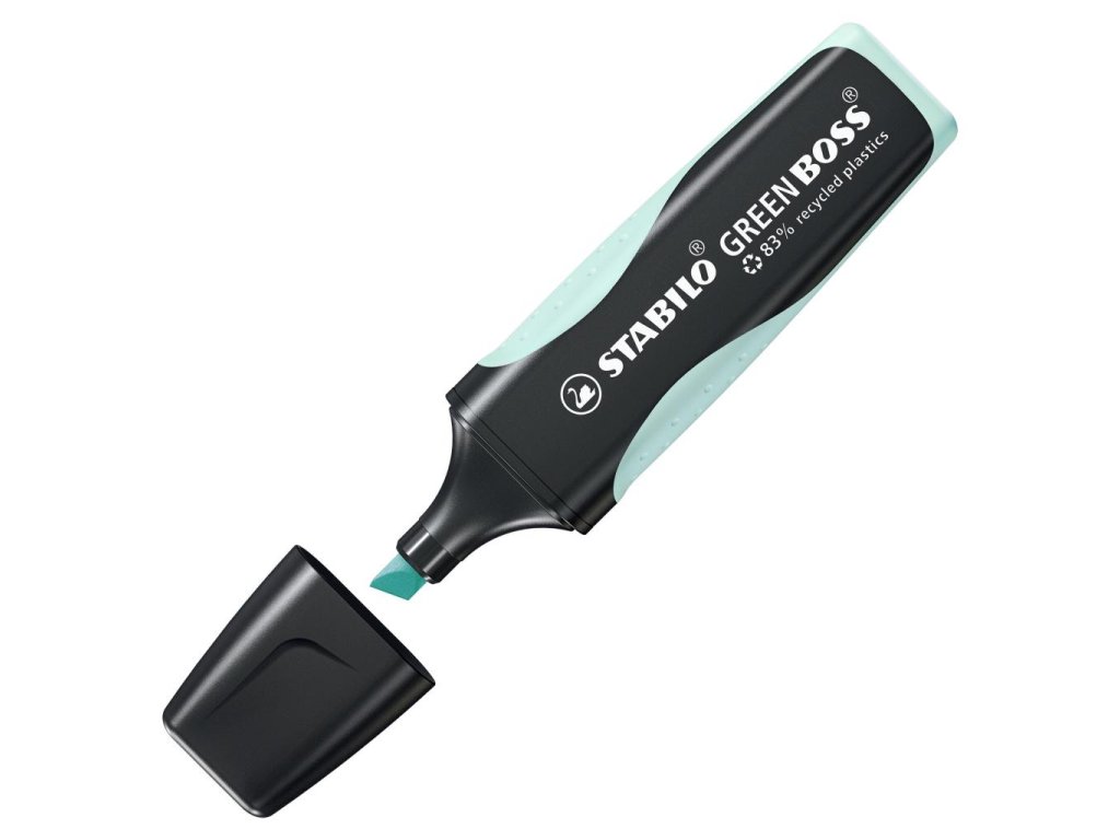 STABILO GREEN BOSS je zvýrazňovač vyrobený z 83% recyklovaného plastu pre školákov, študentov, učiteľov a kancelárskych pracovníkov, ktorí sú ohľaduplní k životnému prostrediu. Ekologický zvýrazňovač je k dispozícii v trendových pastelových a svetlých farbách! Technológia STABILO Anti-Dry-Out chráni pred vysychaním po dobu 4 hodín a zaisťuje koncentrovanú prácu. Značkuje a podčiarkuje v dvoch šírkach stopy 2 a 5 mm. Vďaka protišmykovej zóne úchopu leží bezpečne v ruke. Farba pastelová tyrkysová. Väčšie balenie 10 kusov.- Zvýrazňovač vyrobený z 83 percent recyklovaného plastu
