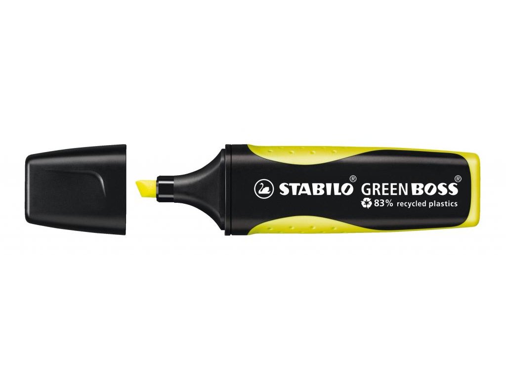 STABILO GREEN BOSS. Zvýrazňovač vyrobený z 83% recyklovaného plastu pre školákov, študentov, učiteľov a zamestnancov kancelárie, ktorí sú ohľaduplní k životnému prostrediu. Štýlový dizajn s protišmykovou zónou úchopu. Technológia STABILO Anti-Dry-Out chráni pred vysychaním po dobu 4 hodín a zaisťuje koncentrovanú prácu. Zvýrazňovač je možné ľahko a pohodlne doplniť náplňami STABILO BOSS ORIGINAL. Atrament na vodnej báze. 2 šírky stopy 2 + 5 mm. Farba žltá. Väčšie balenie 10 kusov.- Zvýrazňovač vyrobený z 83% recyklovaného plastu